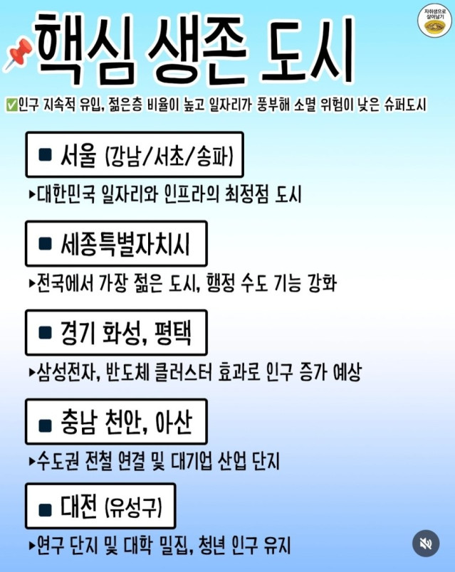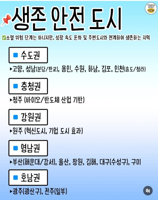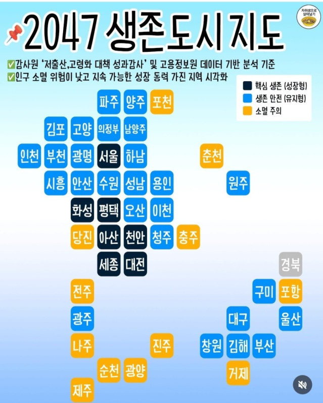 감사원이 지정한 '2047년 생존도시지도'.jpg 작성자 정보 ITsky 작성 작성일 2026.01.27 20:58 컨텐츠 정보 80 조회 목록 본문 ㄷㄷㄷ 김해 겨우 살아 남움 관련자료 댓글 0 등록된 댓글이 없습니다. 로그인한 회원만 댓글 등록이 가능합니다. 목록