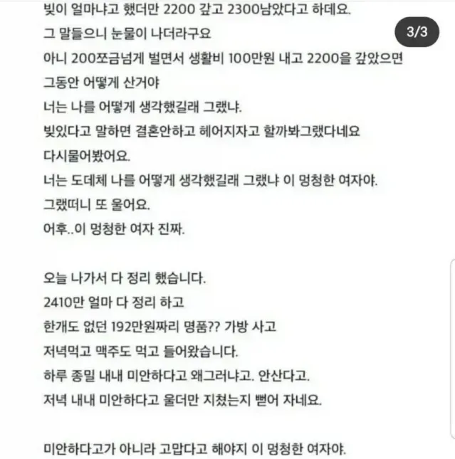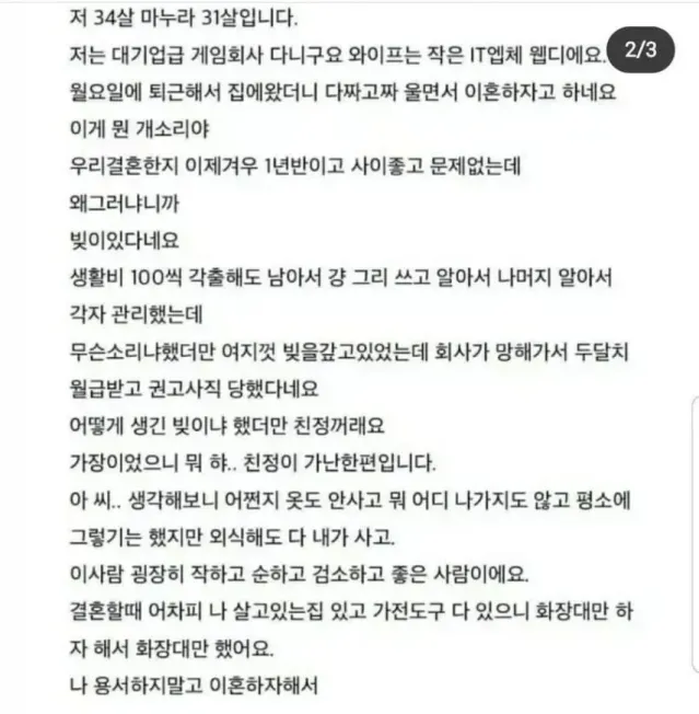 갑자기 이혼하자는 와이프 작성자 정보 강슬기 작성 작성일 2026.01.20 14:50 컨텐츠 정보 204 조회 1 댓글 목록 본문 ????? 관련자료 댓글 1 픽유망주님의 댓글 픽유망주 작성일 2026.01.20 14:51 뻔한 소설 ~~ 뻔한 소설 ~~ 로그인한 회원만 댓글 등록이 가능합니다. 목록