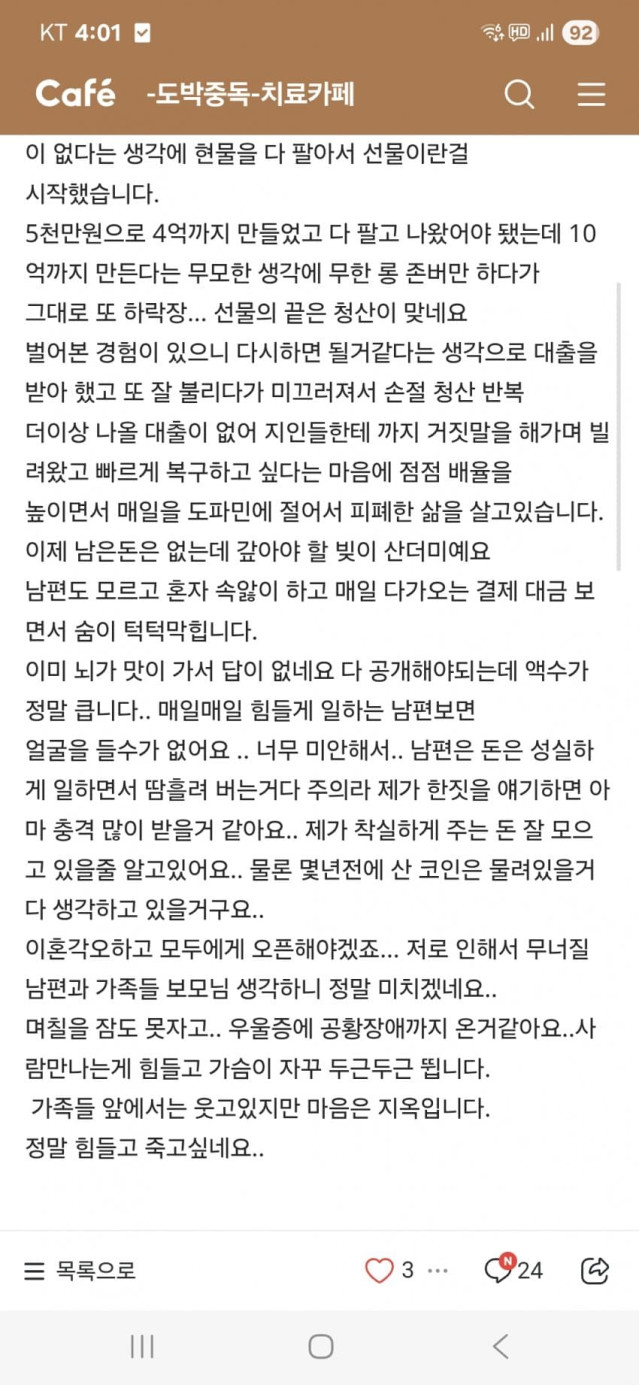 평범한 아줌마가 뭘 알고 선물투자를 했겠냐 그냥 전에 땄던 기억때문에 못잊고 계속 홀짝도박 하는거지
