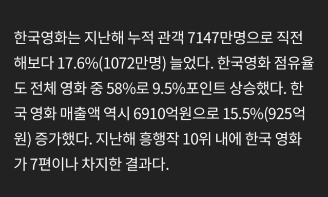 작년에 근소하게 국산영화 매출이 앞섰는데 올해 국산영화 시장이 역대급 폭망했고 크보는 1200만 찍어서 월등히 뛰어넘을듯