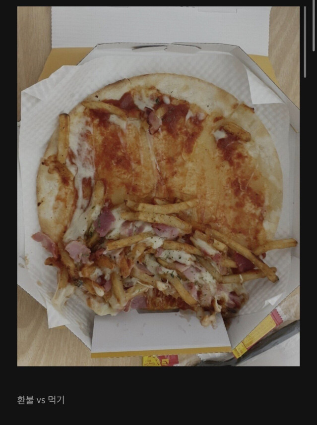 궁금하긴하다 저거 토핑 다시 고루 펼쳐서 먹으면 피자느낌 나긴할까? 이미 느낌이 완전 따로놀거같은데