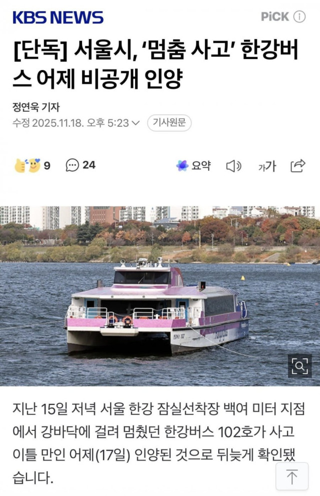 단독] 한강버스 어제 비공개 인양 ㅋㅋㅋㅋㅋㅋㅋㅋ.jpg