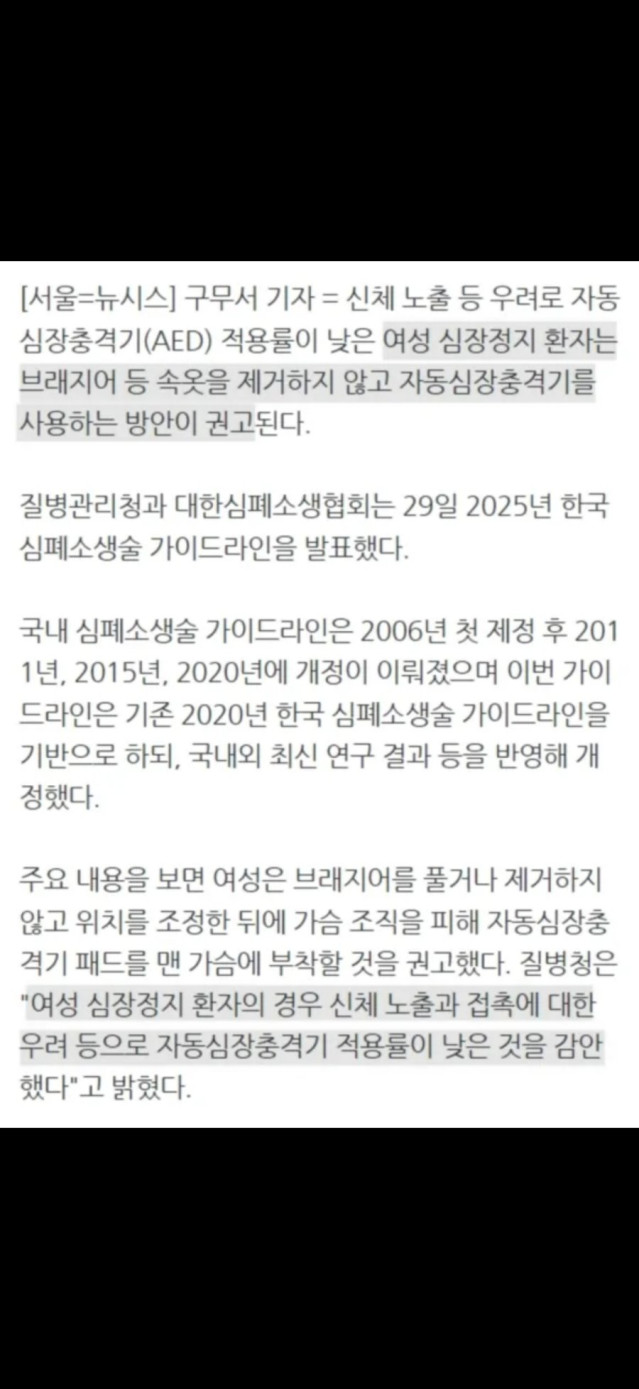 주요 내용을 보면 여성은 브래지어를 풀거나 제거하지 않고 위치를 조정한 뒤에 가슴 조직을 피해 자동심장충격기 패드를 맨 가슴에 부착할 것을 권고했다. 질병청은 "여성 심장정지 환자의 경우 신체 노출과 접촉에 대한 우려 등으로 자동심장충격기 적용률이 낮은 것을 감안했다"고 밝혔다.