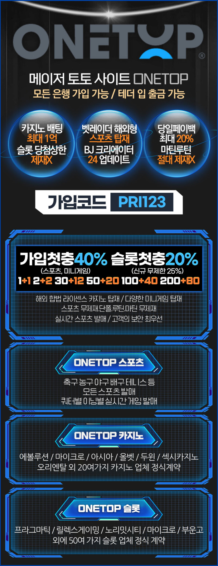 | 특장점 | 가입첫충40% / 카지노베팅 최대1억 / 슬롯 당첨상한 무제한 |